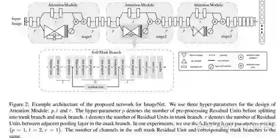 文章中注意力的机制是软注意力基本的加掩码(mask)机制,但是不同的是,这种注意力机制的mask借鉴了残差网络的想法,不只根据当前网络层的信息加上mask,还把上一层的信息传递下来,这样就防止mask之后的信息量过少引起的网络层数不能堆叠很深的问题。