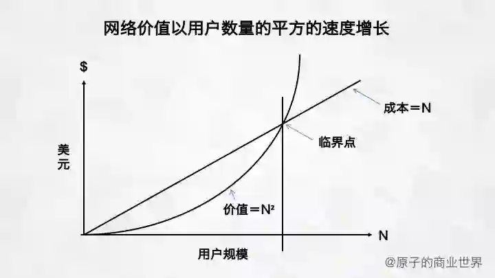 随着网上用户的数量增加(N越大),网络的价值会加速增长,跟N2成正比;而用户获取成本是线性变化的,跟N成正比;达到某一个临界点后,价值将会远远超越成本。