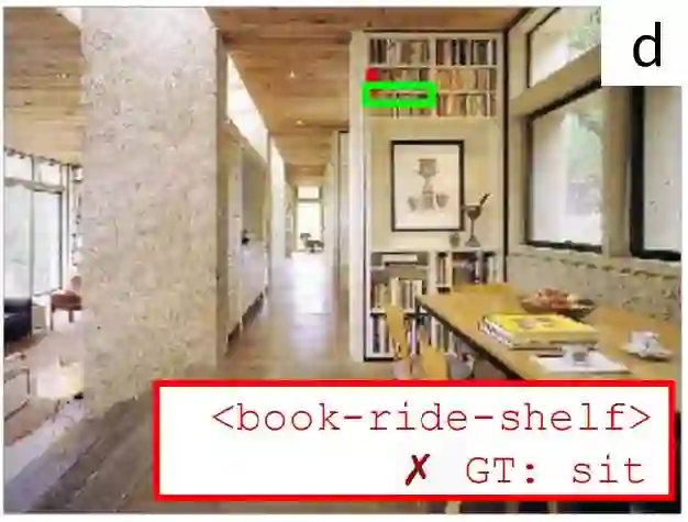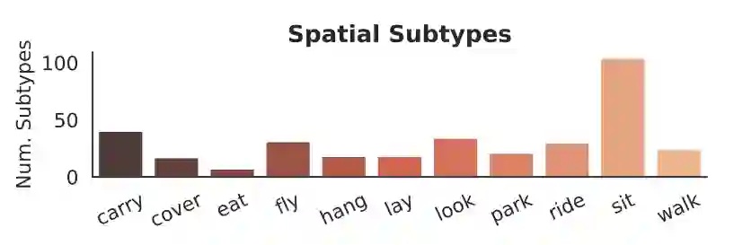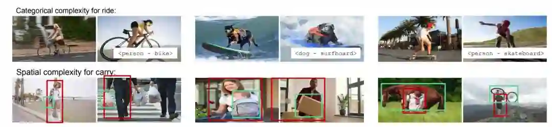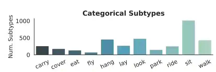 我们定义了一些关系的子类型作为它的变形的度量。子类型可以是categorical,比如说其中一个子类型“ride”可以表示为<person-ride-bike>,或者<dog-ride-surfborad>。子类型也可以是spatial,比如“carry”有一个子类型是携带一个小物体再侧,另一个是扛个大物体举过头顶。
