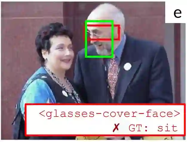 鉴于我们没有使用图像特征,我们生成了一个合理的标签<glass-cover-face>,但是,我们的模型不正确,因为两个典型的不同谓词(sit和cover)在上下文<glasses- ? -face>中共享一个语义。