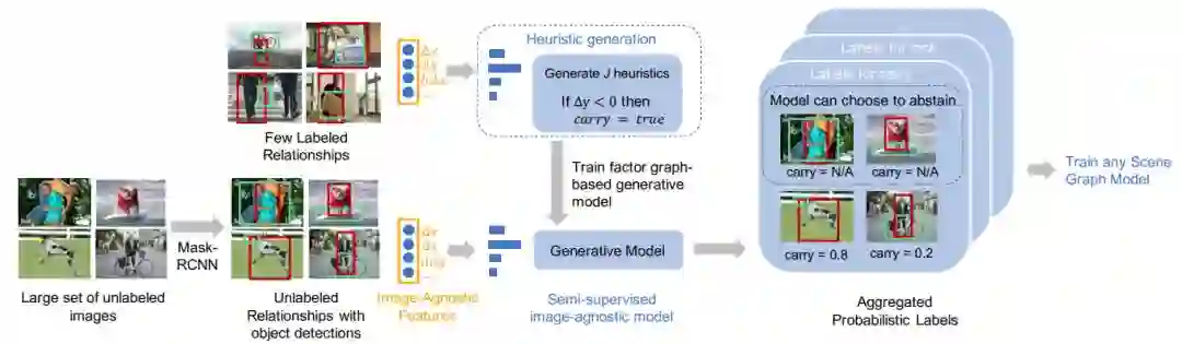 对于关系(例如carry),我们使用与图像无关的特征自动创建启发式,然后使用生成模型将概率标签分配给一大组未标记的图像。然后可以使用这些标签来训练任何场景图预测模型。