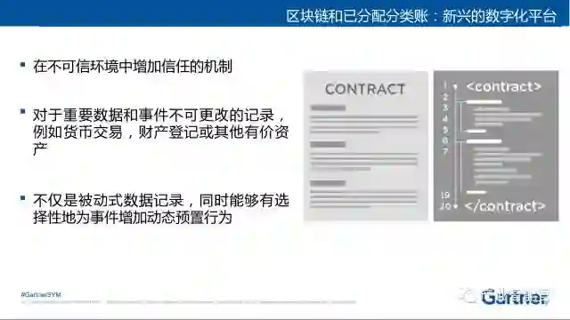 该趋势预测的要点就是在不可信环境中增加信任的机制,对于重要数据和事件不可更改的记录,例如货币交易、财产登记或其他有价资产,不仅是被动式数据记录,同时能够有选择性的为事件增加动态预置行为。