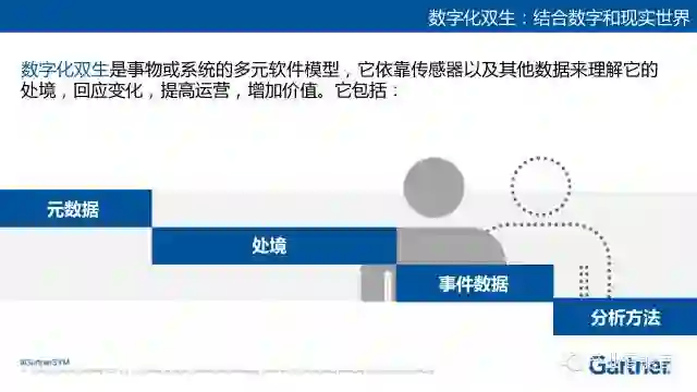 在三到五年内,数以亿计的物件将由数字化双生的形式呈现。组织将使用数字化双生主动修复和规划设备服务、规划制造流程、操作工厂、预测设备故障或提高运营效率,以及执行增强的产品开发。因此,数字化双生最终将成为技术人员和传统监测设备和控制(例如,压力计,压力阀)的组合的代理。