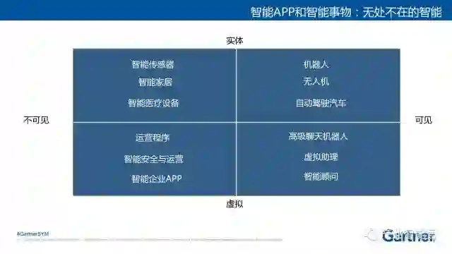 “应用人工智能和高级机器学习带来了一系列智能实现,包括物理设备(机器人,自动车辆,消费电子)以及应用和服务(虚拟个人助理(VPA),智能顾问)”。这些实现将表现为新一类的智能应用和物件,以及为广泛的网格设备和现有的软件和服务解决方案提供嵌入式智能。