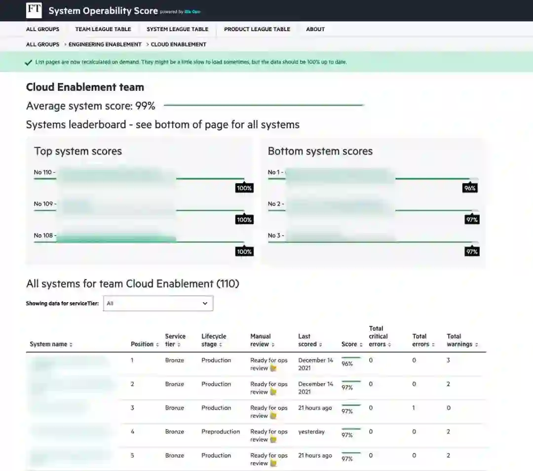 你要尽量让团队都看到各种信息,并用这些信息促使他们做事。我们发现,一旦我们能够向团队展示他们需要改进运营手册的哪些地方,他们就很有可能去做这件事。我们创建了一个带有服务可操作性分数的仪表板,所以团队可以看到他们的工作重点应该在哪里。
