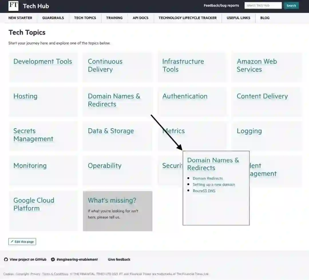 然后,工程师需要做的常规事项应该被记录成文档。总有一些人需要做一些复杂的事情,对此我们的团队有几个 slack 频道和支持这些频道的人手——但对于那 80% 的简单事务来说,文档就应该足够了。最近,我们将工程师的文档合并到了一个 "技术中心(Tech Hub)"。如果你去那里搜索 DNS 关键字,应该就能找到你需要的东西。