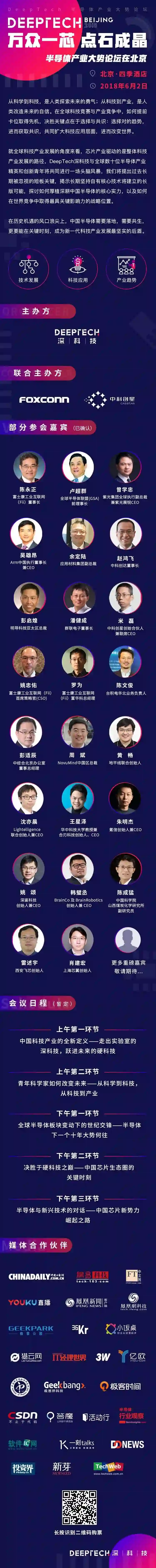 此次DeepTech 深科技联合富士康科技集团、中科创星于 2018 年 6 月 2 日所举行“万众一芯,点石成晶”北京峰会,汇集数十位纵横全球科技产业的领袖精英级人物,将在当天丰富的全日议程中,为到场参会来宾深度剖析中国科技产业新一波大潮将至的机遇与方向。