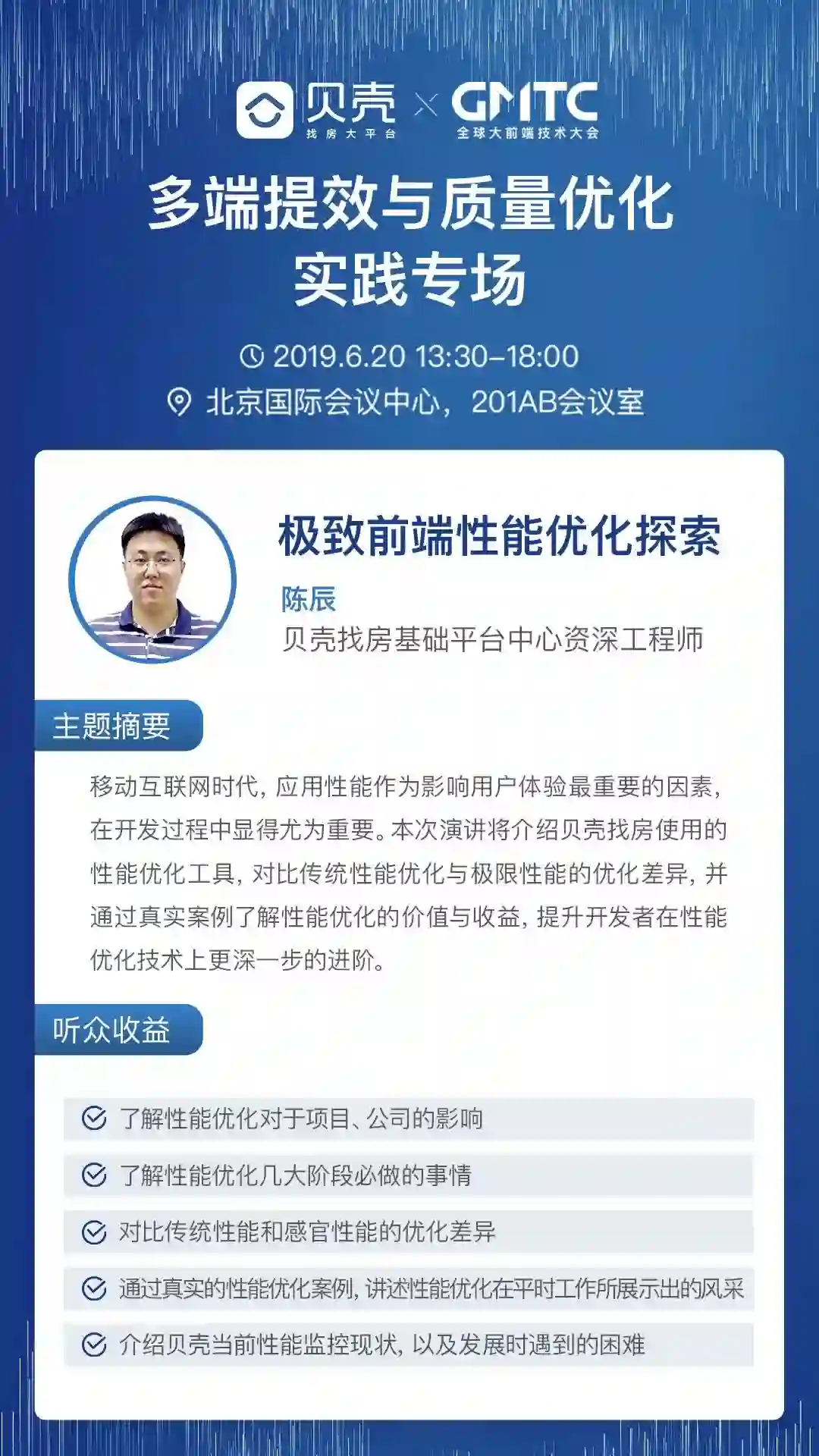 6 月 20 日,2019 GMTC 全球大前端技术大会 《多端提效与质量优化》技术专场,我们邀请了贝壳找房前端架构负责人、慕课网认证前端性能讲师陈辰(cc),为大家解读《极致前端性能优化》,介绍贝壳找房使用的性能优化工具,对比传统性能优化与极限性能的优化差异,并通过真实案例了解性能优化的价值与收益,提升开发者在性能优化技术上更深一步的进阶。
