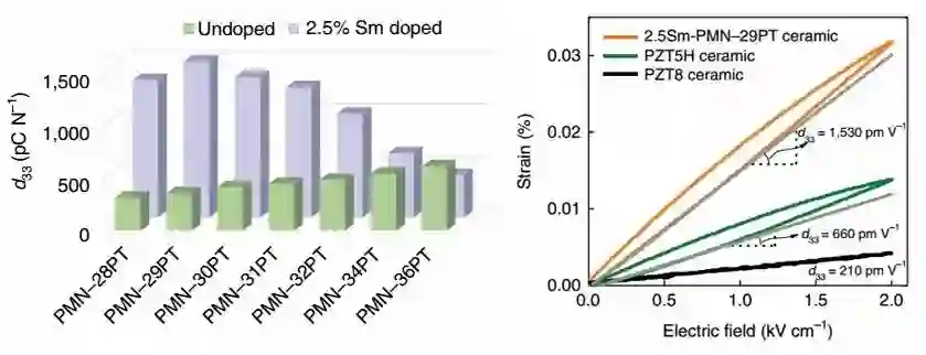 研究团队成功合成出了稀土元素Sm掺杂的Pb(Mg,Nb)O3-PbiTiO3(Sm-PMN-PT)压电陶瓷,获得高达1500 pC/N的压电系数(图二),介电常数超过13000,居里温度为89℃。