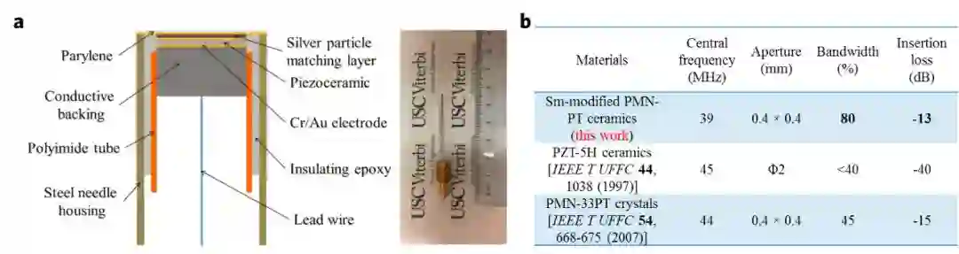 目前,该工作已被包括美国能源部网站、pro-physik、Phys.org等多家科技学术网站进行了跟踪报道。课题组与中国科学院深圳先进技术研究院、美国南加州大学合作,已利用新开发的压电陶瓷设计并制作了40MHz高频超声换能器探头,如图四所示。相比于利用传统P5H陶瓷和PMN-PT单晶制作的超声换能器,该换能器具有更大的成像带宽(80%)和更高的成像灵敏度(-13dB),在高分辨医学成像领域中展现出应用潜力。