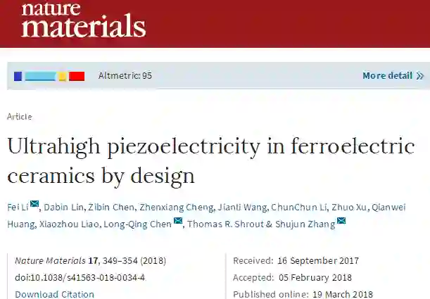 近日,Nature Materials期刊(影响因子39.7)以“设计具有高压电效应的铁电陶瓷材料”为题发表了西安交大电信学院电子科学与技术系教师李飞副教授及其合作者的一篇研究论文,报道了他们在高性能压电陶瓷的设计合成方面取得的重大突破。