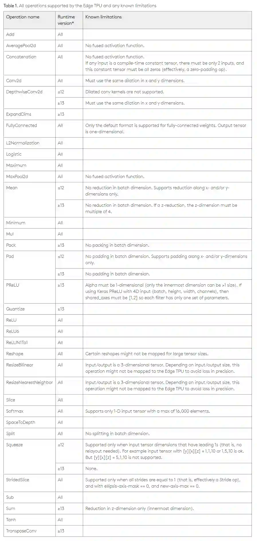 Coral 硬件支持的算子如下: