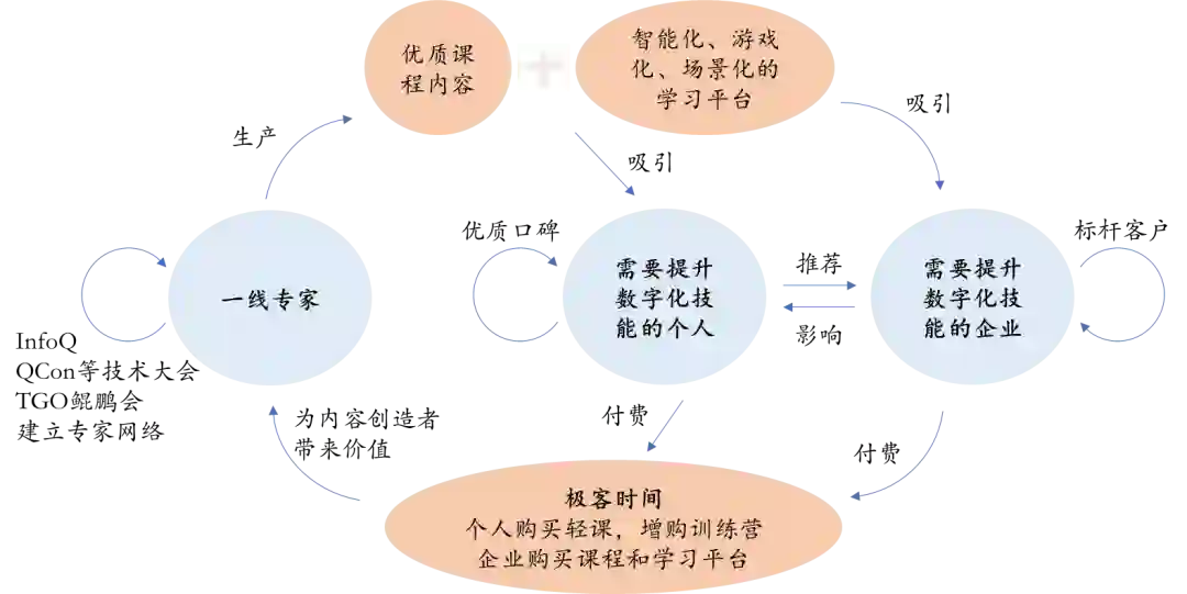 第一块业务是极客时间to C在线教育,包括了几十元到300元的专栏课,也包括了3000-5000元客单价的线上训练营,并形成了低客单价课程积累付费用户量和口碑,向高客单价课程导流的获客模式。
