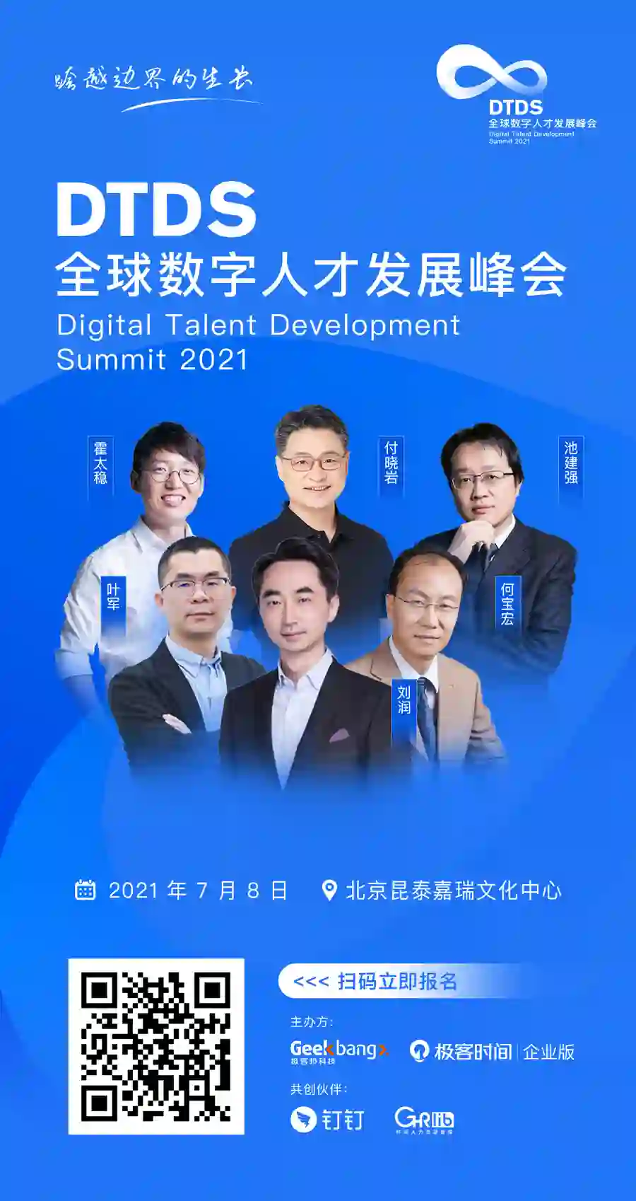 7月8日,中国信通院云大所所长 何宝宏 、润米咨询创始人 刘润、阿里副总裁 叶军、《银行数字化转型》作者/IBM合伙人 付晓岩、极客邦科技创始人兼CEO 霍太稳、极客邦科技总裁/极客时间产品创始人 池建强等多位大咖将齐聚北京「DTDS 全球数字人才发展峰会」,分享“夯实数字经济的基石”、“数字化转型:从信息化到智能化的必经之路”、“企业数字化组织建设及人才培养”、“数字化转型方向与人才培养”、“跨越边界的生长”、“面向未来的智能化学习产品设计”等话题,使用邀请码【geekbang】可免费报名,名额有限,扫码立即参加吧👇