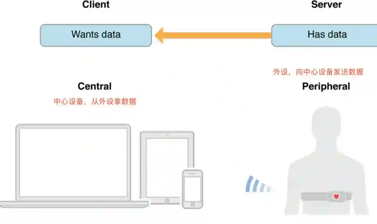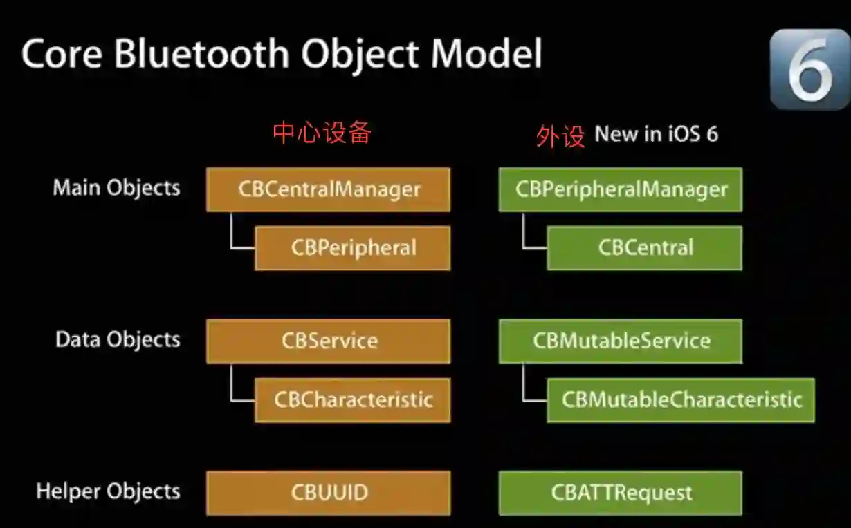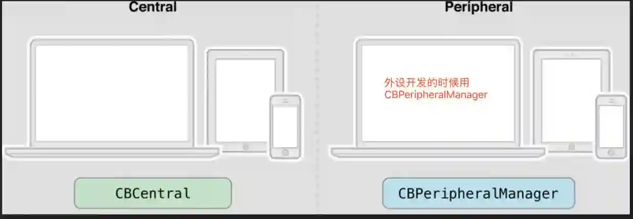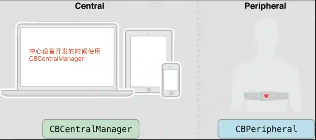 CoreBluetooth可以分为两大模块,中心设备central,外设peripheral,它们俩各有自己的一套API供我们使用。