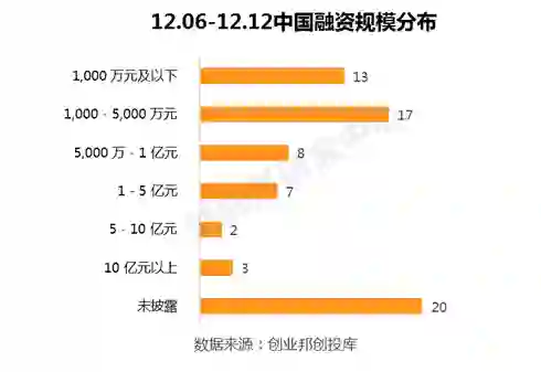 本周融资事件的融资规模主要集中在1,000-5,000万元,共17起。