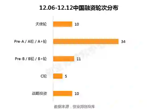 本周融资事件的融资轮次主要集中在早期(种子轮、天使轮、A轮),共44起,其中A轮事件最多,34起;中后期(B轮、C轮、D轮及以后)有16起;战略投资本周有10起。