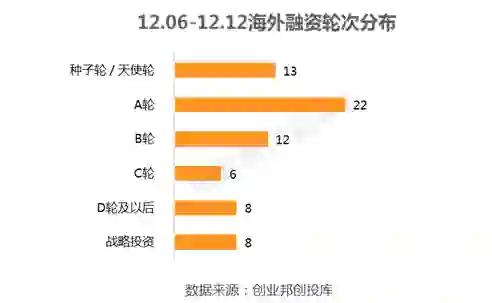 本周海外融资事件的融资轮次主要集中在早期(种子轮、天使轮、A轮),共35起,其中A轮事件最多,22起;战略投资有8起。
