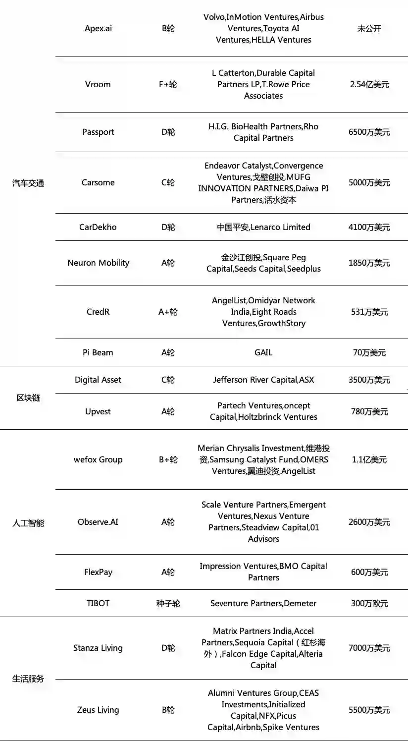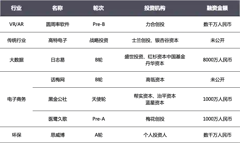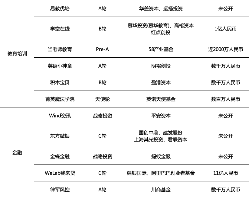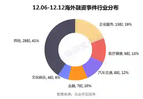 其中融资案例数最多的五大行业分别是企业服务13起,医疗健康9起,汽车交通8起,金融7起,文化娱乐、人工智能消费、电子商务并列4起。