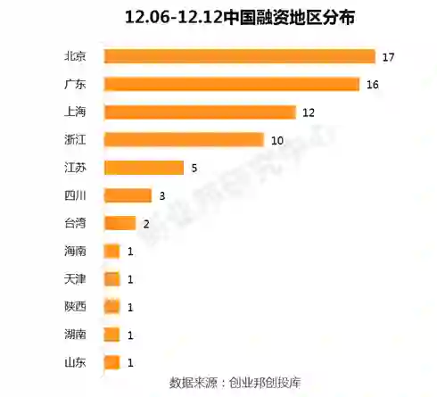 北上广融资事件共45起,占比64.29%;另外,浙江也较受关注。