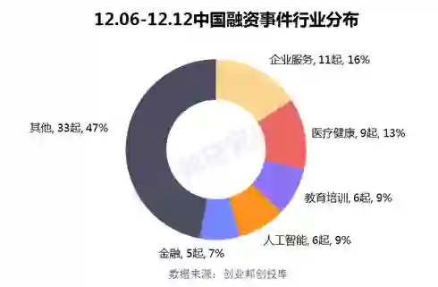 企业服务、医疗健康持续受到资本热捧;金融、硬件行业本周有所回暖,人工智能融资事件略有减少。