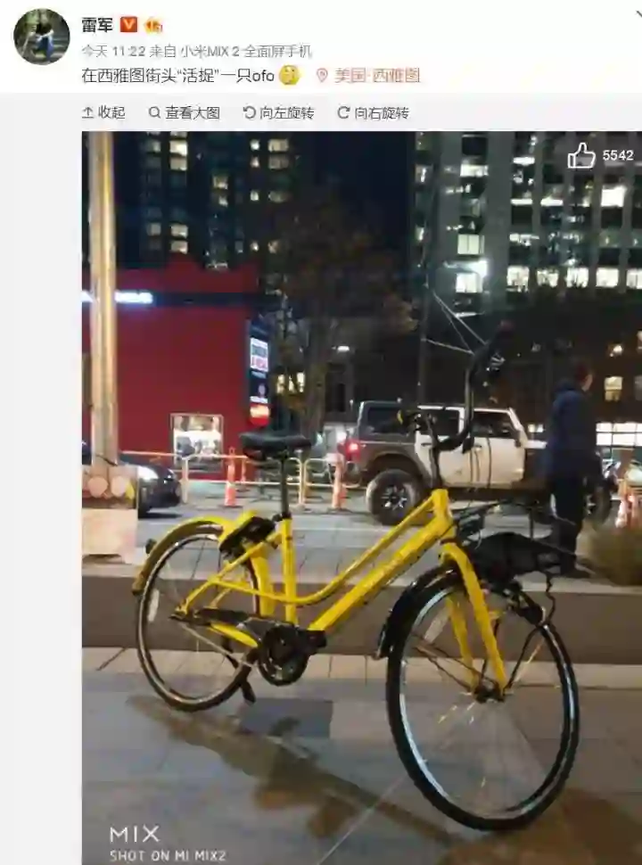 许多网友注意到,雷军经常不时的为“小黄车”打广告,如最近,雷军出访美国,就晒出了一张偶遇 ofo 的图片。