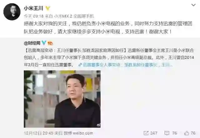 迅雷新任董事长王川许多人也非常熟悉,因为他还有其他的职位——小米联合创始人、小米高级副总裁、小米电视和小米旗下多项关键业务的负责人。