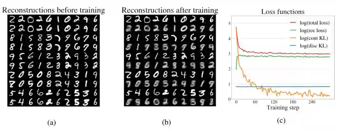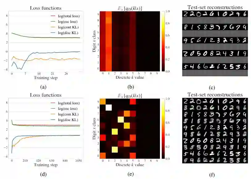 之后很可能发生的是,模型很快学会通过压缩离散的隐变量分布来「破解」VAE 的目标函数。这个问题只发生在无监督环境中,因为在 [16] 中,一旦他们标记了离散隐空间的样本,就可以在同一问题的半监督版本中学习离散隐变量。