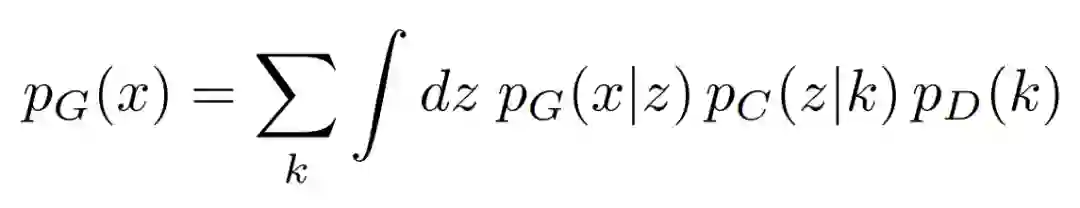 我们考虑一个两层隐变量的分层生成模型 p_G,其中最高层的变量是离散的。具体来说,如果我们用密度 p_D(D 表示离散)表示离散隐变量 k,和密度 p_C(C 表示连续)表示连续的隐变量 z,生成模型由下式给出: