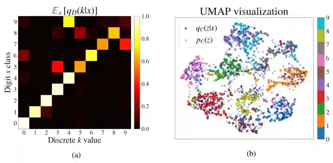 图 5:变分分布的可视化。(a)中每行显示 E _{x | label(x)=l} q_D(k | x)。(b)表示使用 UMAP 降维的 z | x〜∑_ k q_C(z | k,x)q_D(k | x)。使用 1000 个编码的测试集数字和 1000 个先前研究的样本。样本根据数字标签着色。