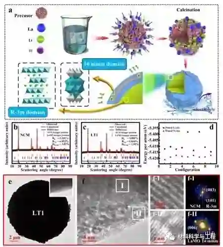研究团队以锂离子电池高容量富镍正极材料LiNi0.8Co0.1Mn0.1O2为研究对象,从分析Ti和La在LiNi0.8Co0.1Mn0.1O2表面的迁移势垒出发,发现Ti掺入体相而La逃离至表面的状态为体系能量最低的状态即稳定状态。根据理论计算结果,合理设计并同步合成了Ti掺杂&La4NiLiO8包覆(简写为Ti&LaMO)的LiNi0.8Co0.1Mn0.1O2正极材料。该改性方法简单,有利于大规模推广,所合成材料具有良好的热稳定性、结构稳定性及优异的电化学性能,为富镍三元材料的开发应用提供新的思路和理论指导。