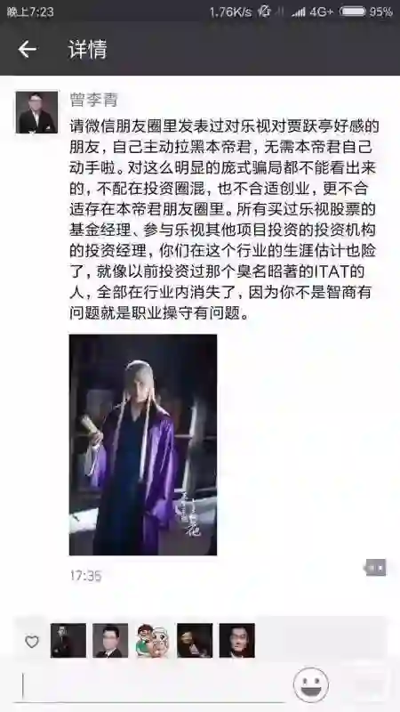 @胡延平:明明群众都已经把瓜皮啃穿了,他却还能捡过来咔咔继续奋力狂咬,服了曾李青这吃瓜姿势了。这样的认知、格局,做腾讯COO做到07年的确也就到头了。连形成业务亏空、庞氏骗局以外的第三种认知的能力都没有,只能说刚愎自重、心窄气短。乐视在财技欠佳的情况下财务失控,在主业不扎实的情况下生态扩张,在人和事都一再失察的情况下超级汽车(非FF)巨额浪费、手机业务巨额亏空,在银行很早就开始群歼万达式的抽刀断水的情况下不及时做重大调整,在这个擅于以最大的恶意去揣度别人的信任匮乏的社会里透支信任,令到对FF、智能电视、影业等实力潜力健康业务有实际了解并鼎力支持的业者也心生积忿。但是,无论乐视归去何处,了解实际状况、业态玩法、有些第三种认知的业者,是不会做菜市口式的围观、曾李青式的落井下石的。局外人清醒为好,静观为宜。新业态在这个国度一路走来,最成功一定不是贾跃亭式的反常者,最需要同时也是最成功的必然是马化腾式的前行者,而唯独不缺的就是曾李青式的补刀客。明明只是围观,却要上去狠踩一脚狠捅一刀,明明只是吃个消暑解渴的大西瓜,却能在瓜皮上奋力咬出后槽牙的动静,也是醉了,这种人几千年来太多了。
