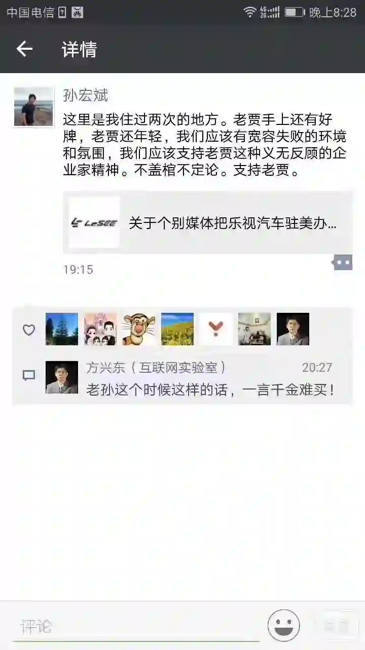 而随后,在不到两个小时内,孙宏斌针对自媒体爆出贾跃亭在美国拥有豪宅的消息,发朋友圈表示对贾跃亭的支持。朋友圈内容如下: