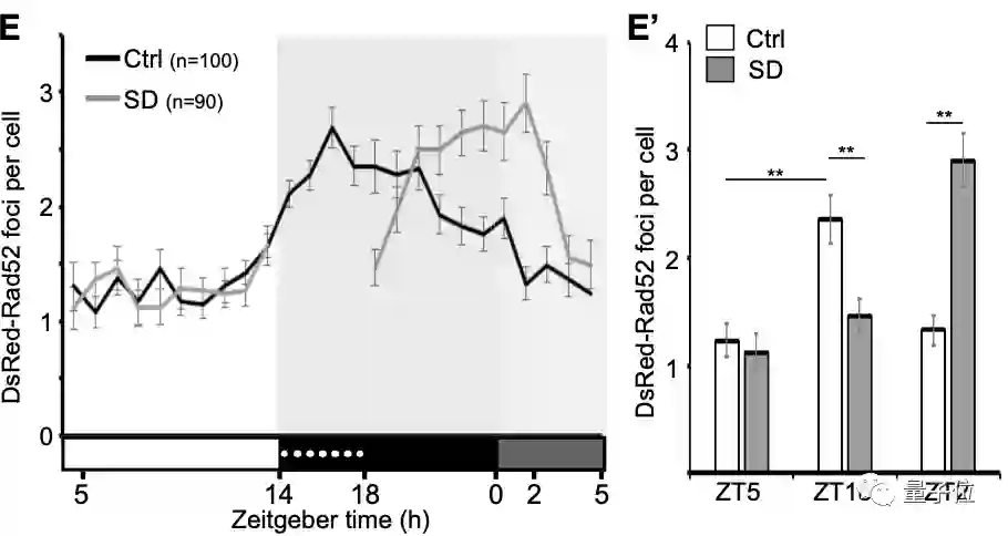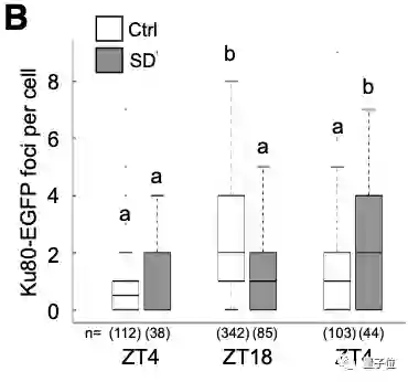睡眠不足的幼体体内的Ku80-EGFP病灶数量较之对照组较低,而在第二天增加睡眠后,达到了对照组幼体的正常夜间水平。