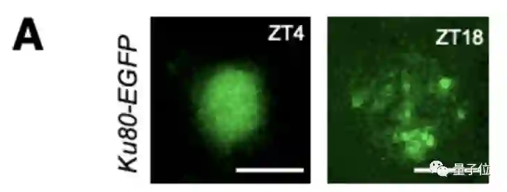 可以看到,在白天,Ku80-EGFP病灶数量少,而在夜间,病灶数量增加。