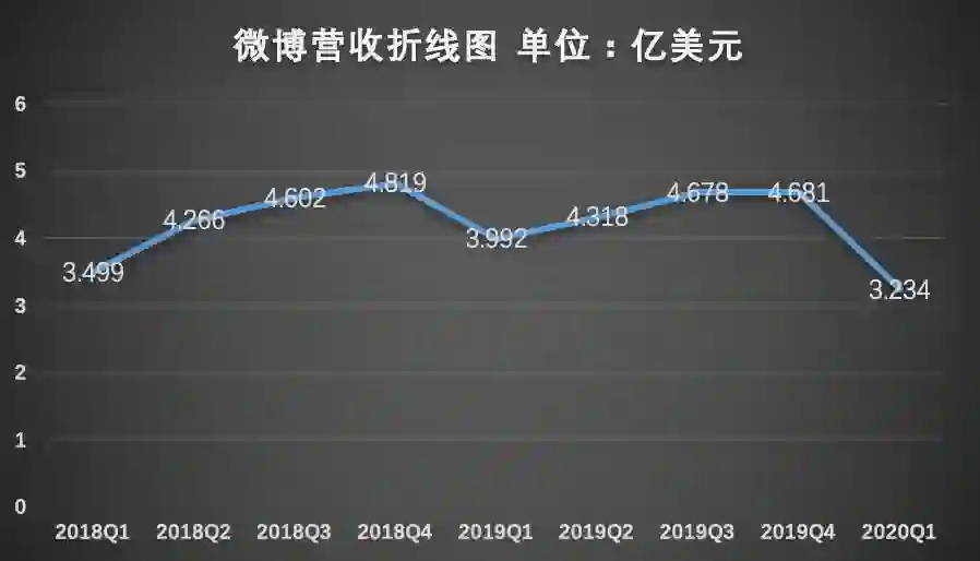 这种变化直接体现在微博中的营收增速上。它从2018年Q1的64%,一路下跌到2020年Q1的-19%。