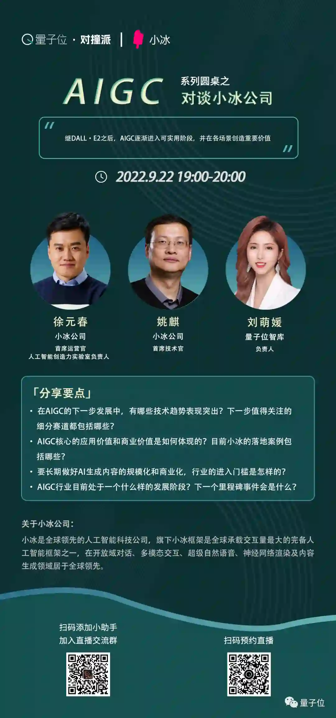 9月22日晚19:00,我们请到了国内AIGC的开拓者——小冰公司,将由小冰公司首席运营官、人工智能创造力实验室负责人徐元春与小冰公司首席技术官姚麒为我们分享~
