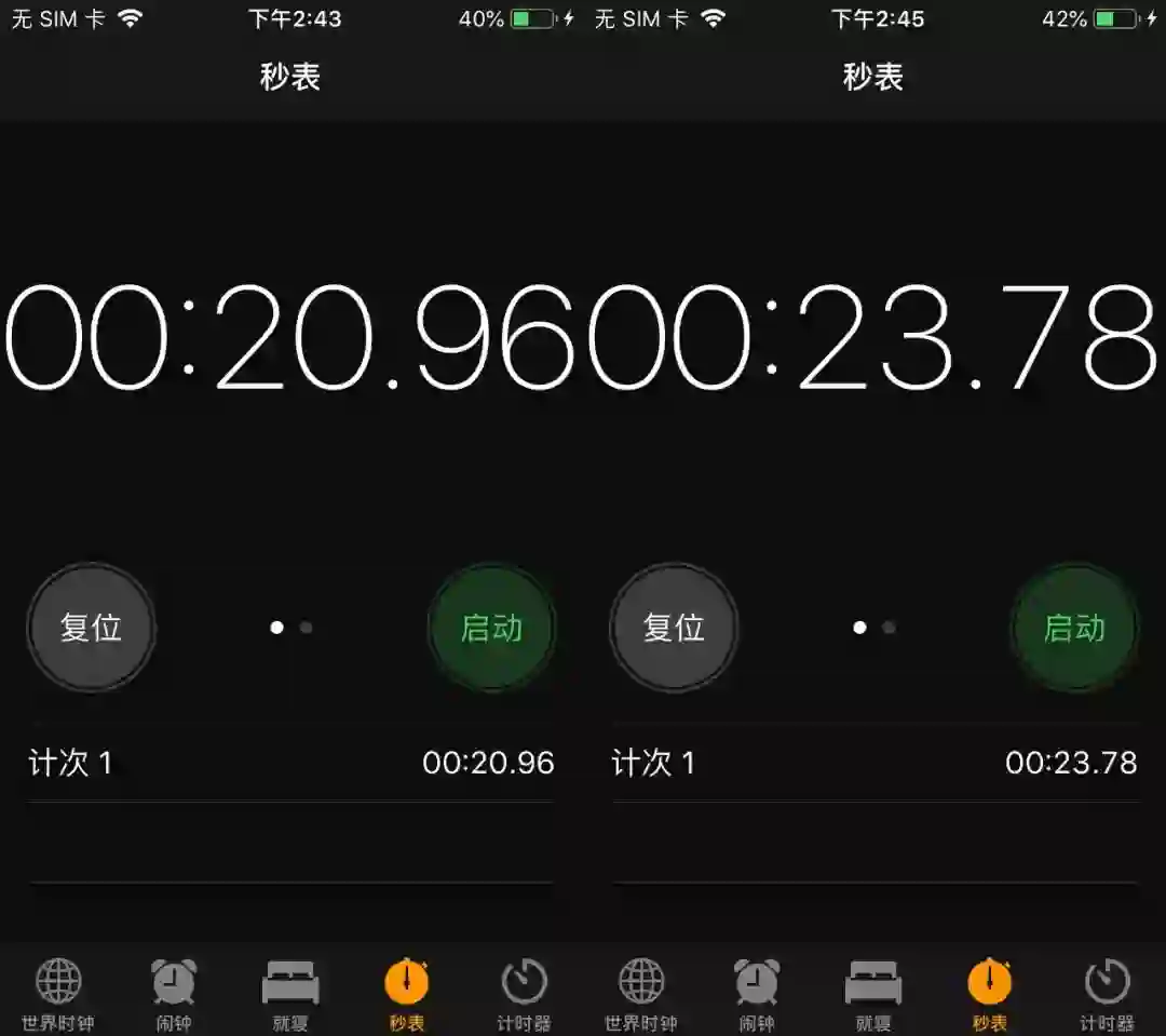 iPhone XS Max 耗时 21 秒,iPhone 8 Plus 不到 24 秒,差距非常微弱。