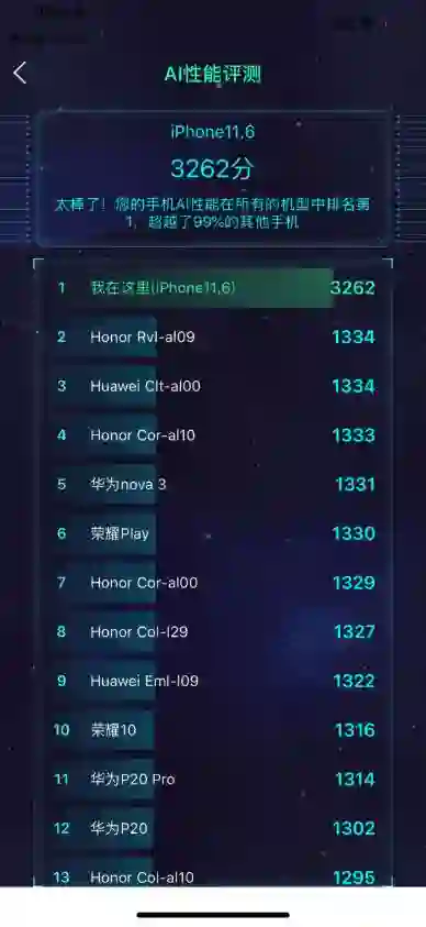 此外,根据官方的说法,A12 的 AI 引擎性能提升幅度极大,从双核架构变成了 8 核设计。我们尝试用鲁大师旗下的 AI 跑分软件测试了一下,最终 iPhone XS Max 的得分为 3262,在目前所有机型中排名第一,遥遥领先于友商的产品。