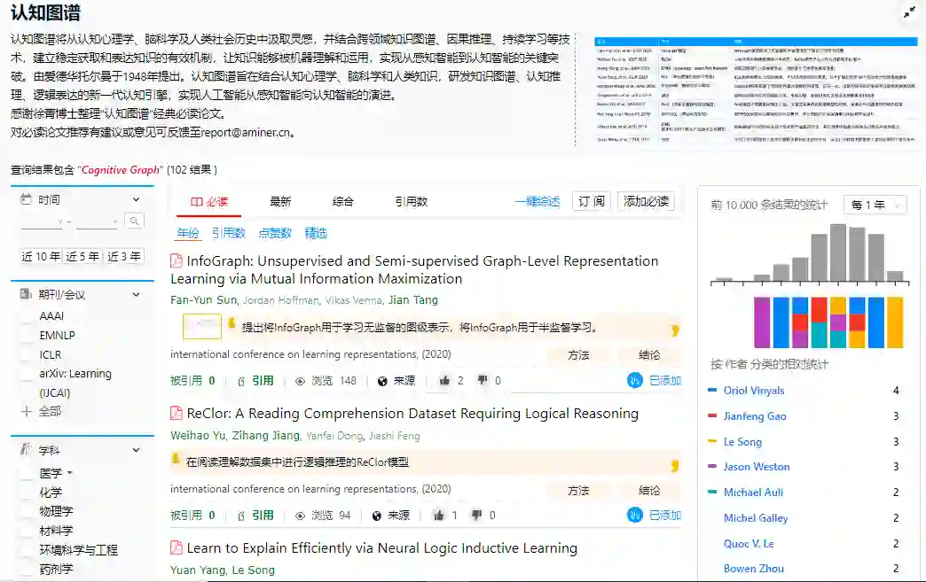 那么,想深入学习和研究认知图谱,研读该领域的经典论文,对于研究者和从业者都必不可缺。经过我们对人工智能领域国际顶会/期刊中“认知图谱”相关关键词论文的计算,以及热心读者徐菁博士的整理,AMiner 推出了 100 篇认知图谱经典必读论文。这些论文可以说基本都是经典中的经典,他们多是领域大佬+顶级会议的组合,读完它们,相信你对认知图谱的认认识肯定会有质的飞越。