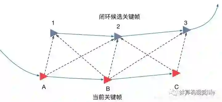 4. 连续性检测。现在,进一步对候选关键帧进行筛选。闭环不仅仅是单帧对单帧的匹配,好的闭环应该是多帧对多帧的闭环。也就是形成连续闭环,如下图所示。这一步请参考[4]。