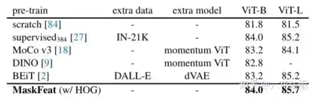 就这么简单,没有BEiT那种复杂的dVAE,MaskFeat 不仅在视频方面取得了不俗的性能,而且在图像方面也有不俗的性能,在ViT-B模型上性能超越BEiT、SimMIM、MAE等