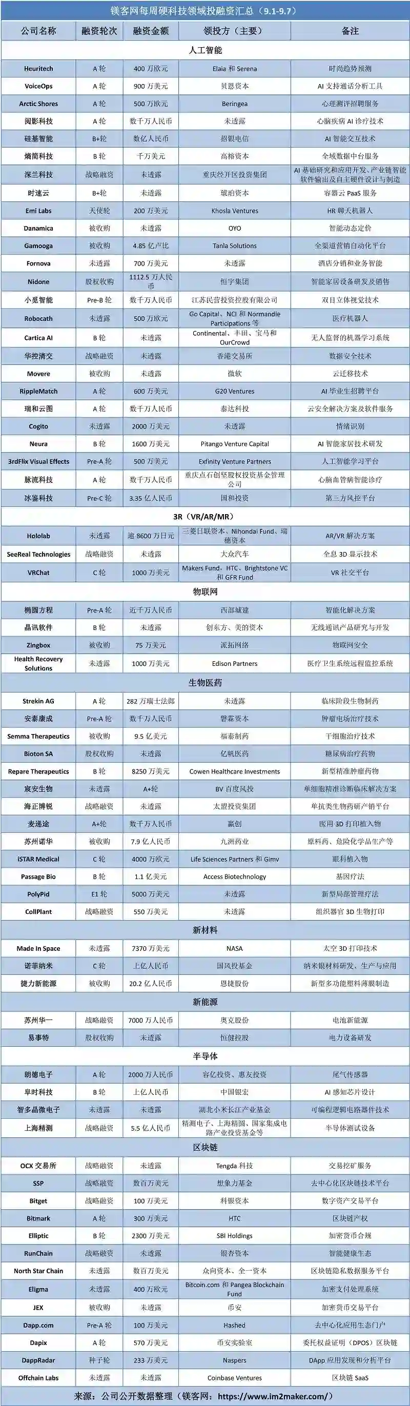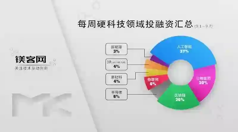 本周硬科技领域投融资事件一共67起,人工智能领域发生21起融资事件和4起收购事件,占比37%;生物医药领域发生10起融资事件和3起收购事件,区块链领域发生12起融资事件和1起收购事件,分别占比20%;物联网发生3起融资事件和1起收购事件,半导体领域发生4起融资事件,分别占比6%;3R(VR/AR/MR)领域发生3起融资事件,新材料领域发生2起融资事件和1起收购事件,分别占比4%;新能源领域发生1起融资事件和1起收购事件,占比3%。