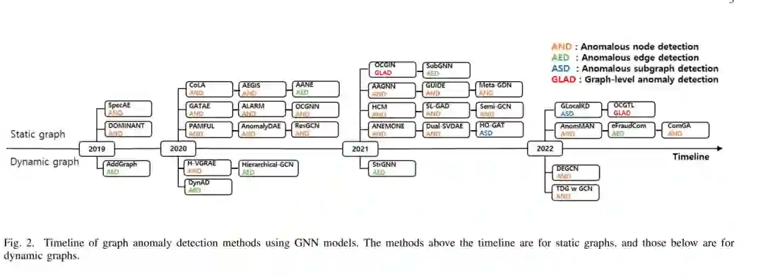 在本综述中,我们概述了基于GNN的图异常检测方法,并主要从图的类型(即静态图和动态图)进行了综述。与其他调研相关的话题——图异常检测(一般)[2],[3],图像异常检测具体使用深度学习[11],[12],和一般的异常检测使用深度学习[13],[14],本调研旨在涉及的独特角度图使用GNN异常检测模型。鉴于GNN在图异常检测中的重要意义和正在进行的积极研究工作,我们相信,对这一特定主题的全面调研是及时的,对研究社区是有益的。图2为调研方法的时间轴。第三节中的调研是根据其他图异常检测调研[3]、[2]、[11]、[12]所使用的分类框架组织的。这一领域仍然是新的,尽管研究主题的分布似乎倾向于静态图中的节点异常,但已发表的方法覆盖了广泛的图(静态与动态、普通与属性)和异常类型(结构、节点、边、子图)。此外,在第四节中,我们分享了关于使用GNN进行图异常检测的几个有前途的机遇和挑战的观点。