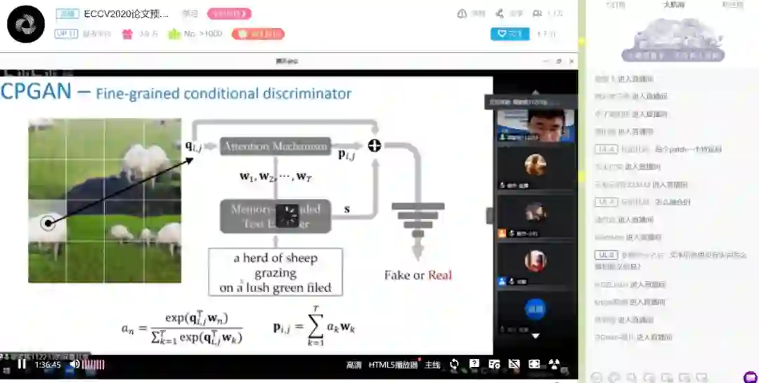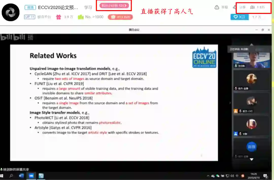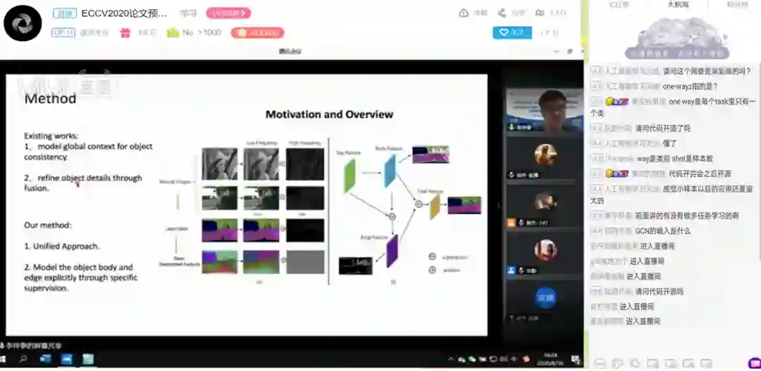此次CSIG-ECCV 2020论文专题学术报告会持续了四个半小时,十六位优秀的讲者既生动展示了四个专题的前沿技术、最新研究成果,又为感兴趣的与会观众开展研究指明了方向。报告会采用云直播的方式,线上参与人气峰值达到1.8万,进入了娱乐小时榜前130。观众通过线上弹幕积极进行互动、交流和提问,讲者也给出了详细的解答,极大地鼓舞了大家的科研热情。我们期待优秀青年学子在计算机视觉领域取得更多研究进展,并在未来的报告会中踊跃参与、共同进步!