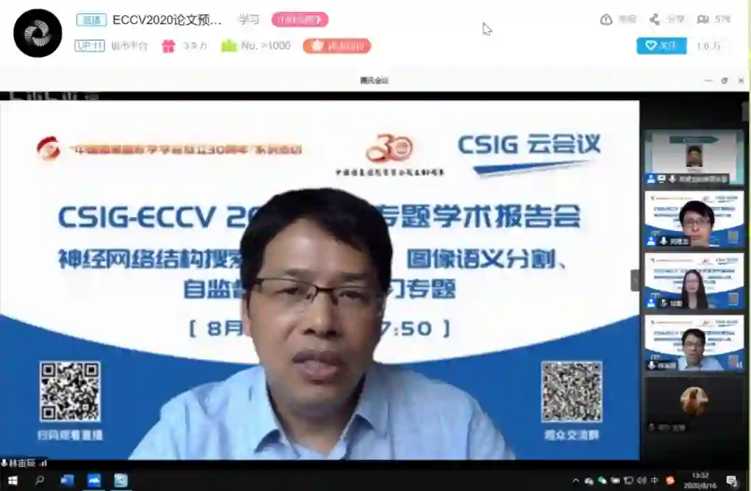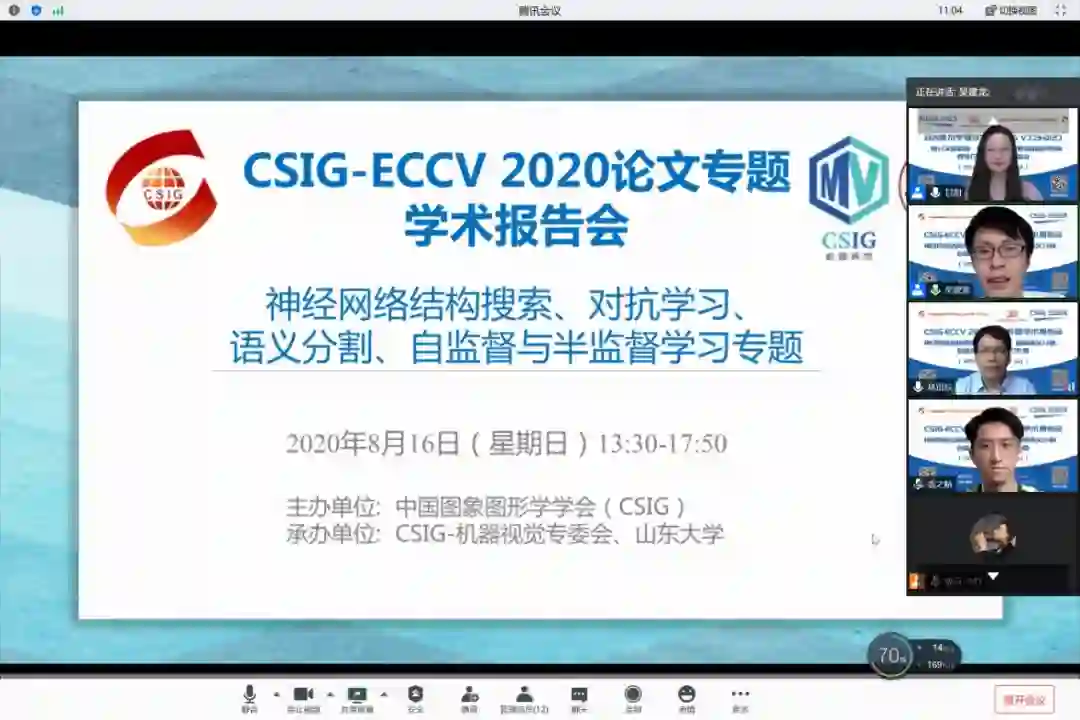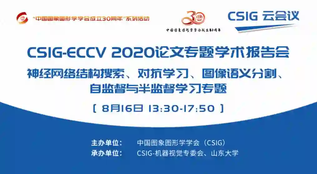 CSIG-ECCV 2020论文专题学术报告会以云直播的方式于2020年8月16日成功举办。本次学术报告会由中国图象图形学学会(CSIG)主办,CSIG机器视觉专委会和山东大学联合承办。山东大学甘甜副教授、吴建龙助理教授担任本次报告会的执行主席。报告会邀请16位优秀的青年学子介绍他们ECCV2020录用论文的最新研究成果,向相关领域研究者、技术开发人员和研究生介绍神经网络结构搜索、对抗学习、图像语义分割、自监督与半监督学习四个专题的最新进展。