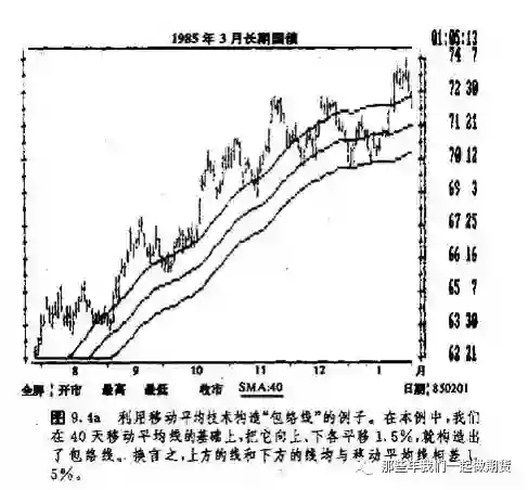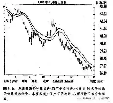 6.如果我们针对每日的最高价和最低价,分别采取与在收市价格下同样的移动平均方法,就得到了价格带(包容带)。它由两条移动平均线形成——一条是关于最高价的,一条是关于最低价的(见图9.5a