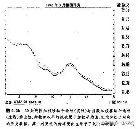这是一种更为复杂的平均方法,称为“指数加权移动平均值”,它一举解决了简单平均值法所面临的两种责难。首先,指数加权平均值给较后来的价格以较大的权重,由此,它属于加权平均值的性质。另外,尽管它给予过去价格的权重较小,却的确囊括了自期货合约上市以来所有的历史价格。不用说,它的计算公式很繁复,我们必须借助计算机来计算。乍看起来,既然指数加权平均值法不但同时解决了简单平均法的两个缺陷,而且在这两方面还翻出了新名堂,那么,它在上述三种方法中就该最合用。可惜,事实并不尽然。本章后面将要比较三者的优缺点。