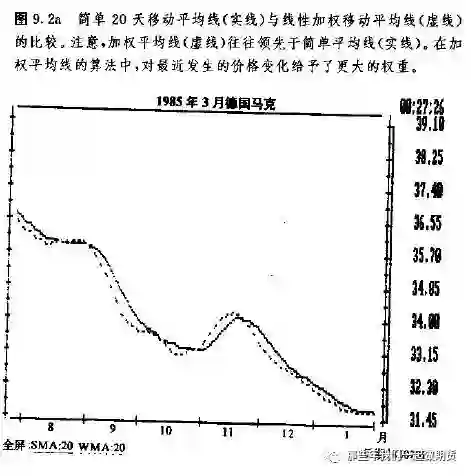 所谓简单移动平均值,即算术平均值,它最常用。但是,也有人怀疑其效果。主要的疑问有两个。第一种批评是,每个平均值仅仅把它所覆盖的那段日子(例如最近10天)包括进来。第二种批评是,简单移动平均值对其中每一天都一视同仁。例如在10天平均值中,最近l0天中每一天的分量都同当天的一样,每天的收市价格都占有10%的权重。在5天平均值中,每天的权重都是20%。有些分析者认为,距当前越近的日子的价格变化应当具有越大的权重。