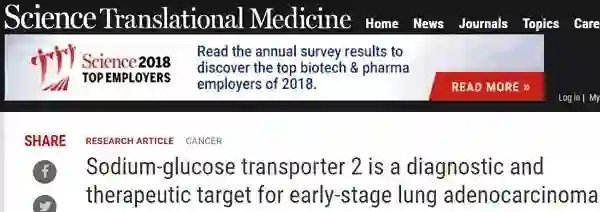 11月14日,《Science Translational Medicine》期刊发表了这一篇题为“Sodium-glucose transporter 2 is a diagnostic and therapeutic target for early-stage lung adenocarcinoma”的文章,来自加州大学洛杉矶分校Jonsson综合癌症中心的研究团队最新发现,钠-葡萄糖共转运蛋白2(sodium glucose transporter 2,SGLT2)在肺癌细胞利用葡萄糖中发挥重要作用。
